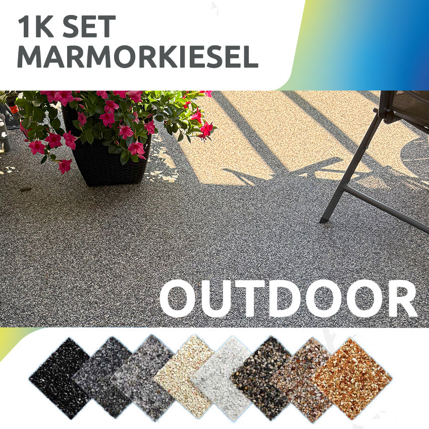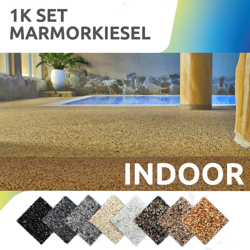Mit unseren Steinteppich-Komplett Sets verwandeln Sie Ihren Boden im Aussen-/Innenbereich in einen Blickfang. Die Sets beinhalten alle Komponenten für die optimale Verlegung eines Steinteppichs. Sie erhalten bei uns Komplette Sets im System aber auch Bindemittel oder Marmorkiesel einzeln.